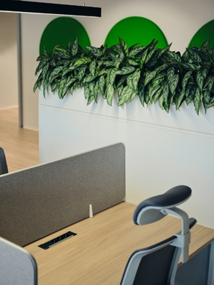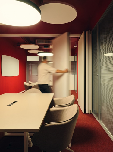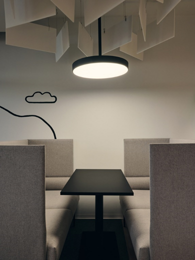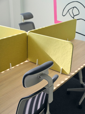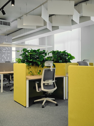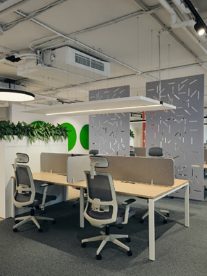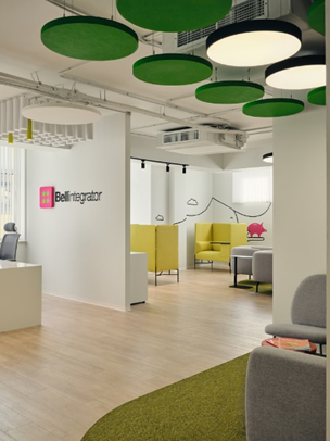 Поскольку новый офис компании Bell Integrator был задуман по принципу open space, важно было создать акустический комфорт на рабочих местах сотрудников. Этого удалось достичь с помощью дополнительных навесных акустических панелей на потолке, а также акустических настольных экранов.