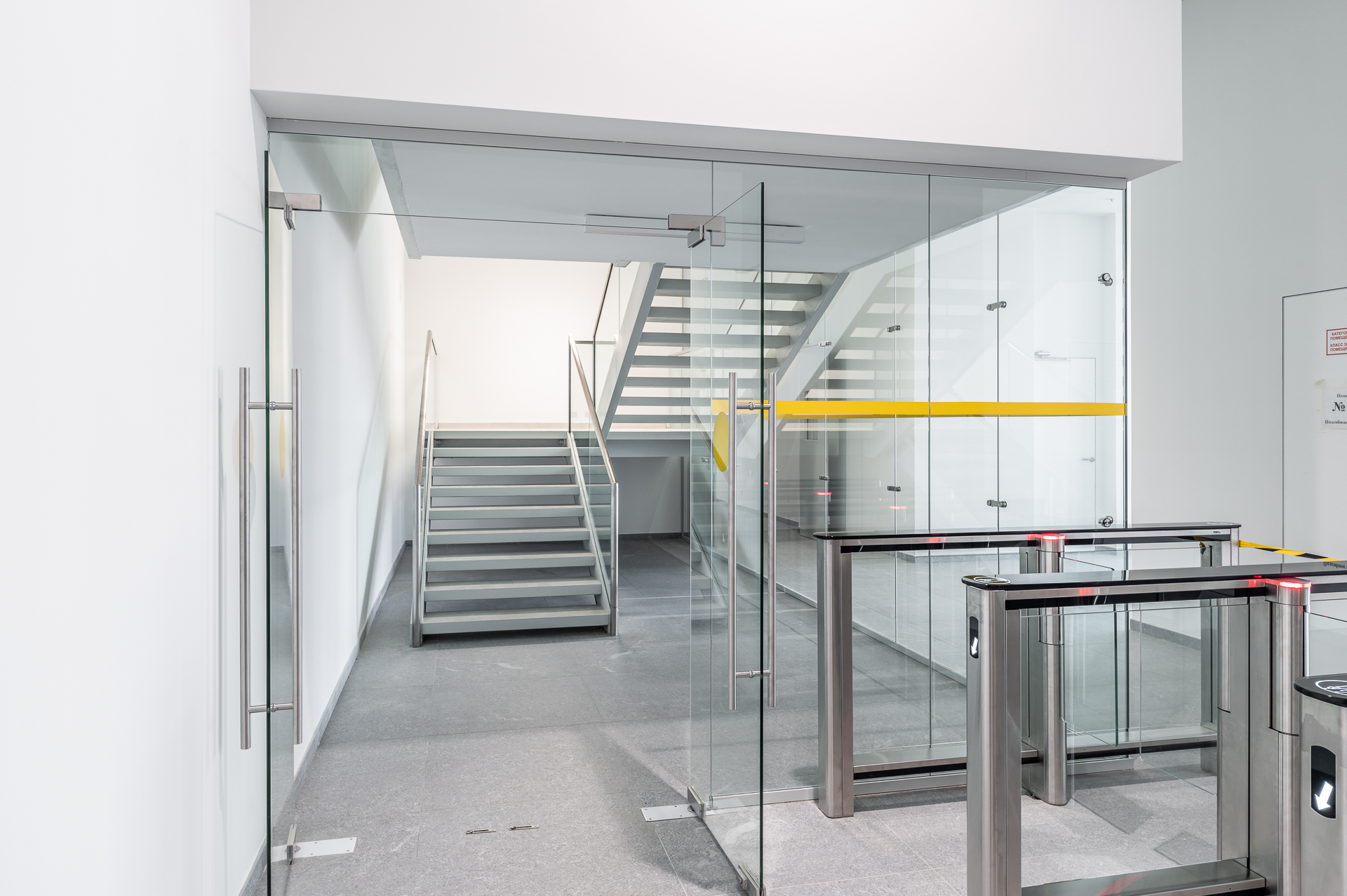 Были смонтированы стационарные цельностеклянные перегородки NAYADA-Crystal. Имеют заполнение из закаленного прозрачного стекла толщиной 10 мм. Высота нижнего алюминиевого зажимного профиля 20 мм, верхнего 40 мм, окраска по RAL 7035 матовая. Примыкание к стенам осуществляется за счет алюминиевого П-профиля 15х15х15 мм.